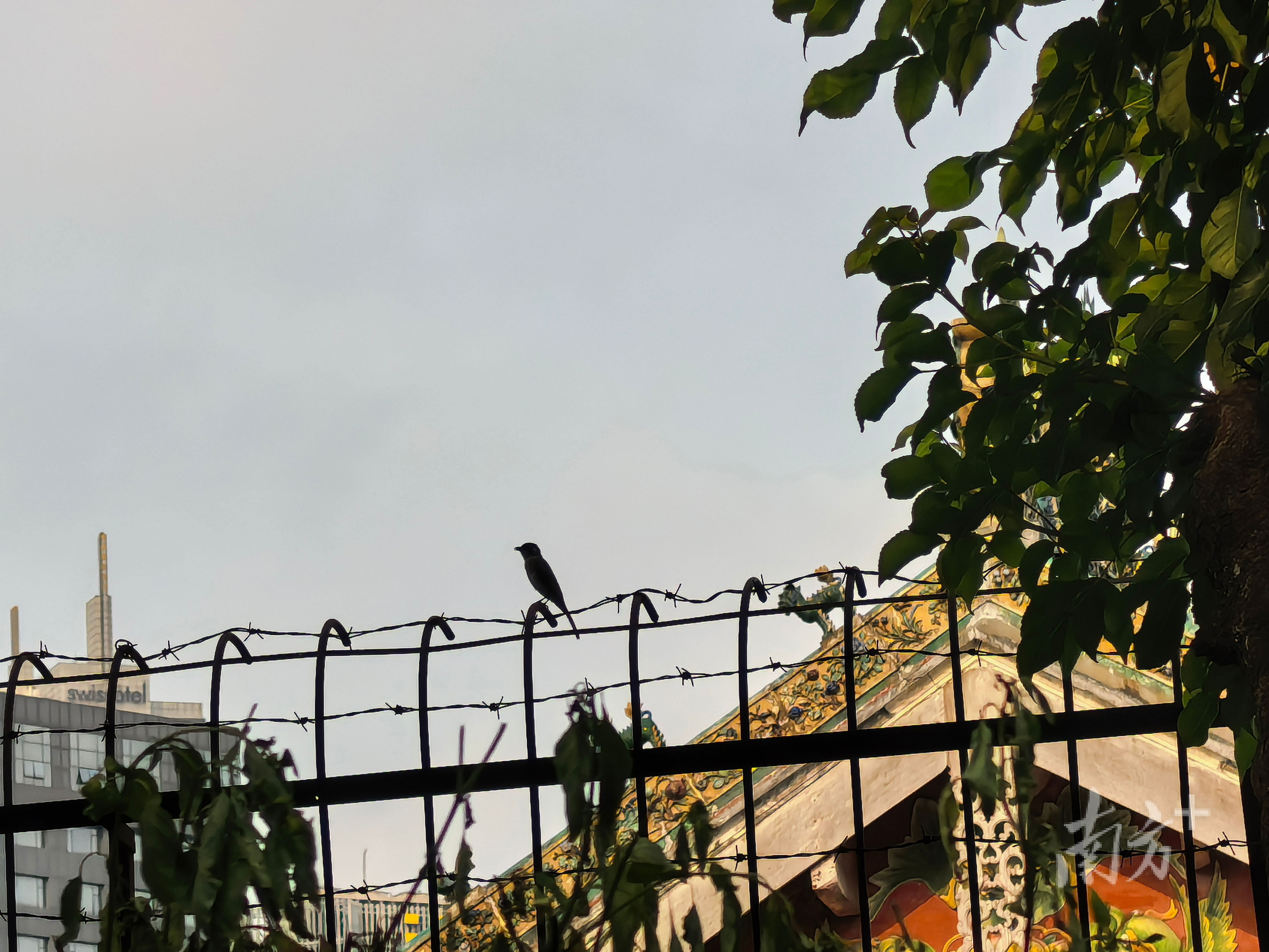穿梭在古迹缝隙里的小生灵,让古建筑有了鲜活的温度。小鸟们用灵动的身影与清脆的啼鸣,早早唤醒百年砖瓦的生机。北帝正殿外的浓荫深处,鸟鸣清脆,几只乌鸫立在枝头最高处,叽叽喳喳,与垂落的紫荆豆荚相映成趣;白头鹎栖于祖庙围墙铁丝围栏外,啾鸣婉转;白鹡鸰立于檐角之上,快速抖动着尾巴,仿佛那檐角也要振翅欲飞;即使上午游客成批到来,也不妨碍一双珠颈斑鸠在这里从容觅食……