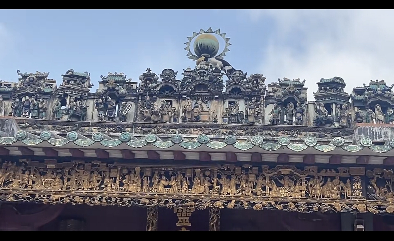 其实祖庙的“灵宠”,一半是烟火,一半是历史。作为岭南古建筑的巅峰之作,佛山祖庙古建筑的灵魂藏于屋脊之上。六条大型石湾陶塑瓦脊绵延起伏,构成了架设于空中的艺术长廊。小鸟最喜欢的鳌鱼就是正殿瓦脊的核心构件之一,龙头鱼尾,气势磅礴。它作为岭南建筑特有的防火神兽,寓意“吞火镇宅、独占鳌头”,是祖庙最威严的“守护神”。