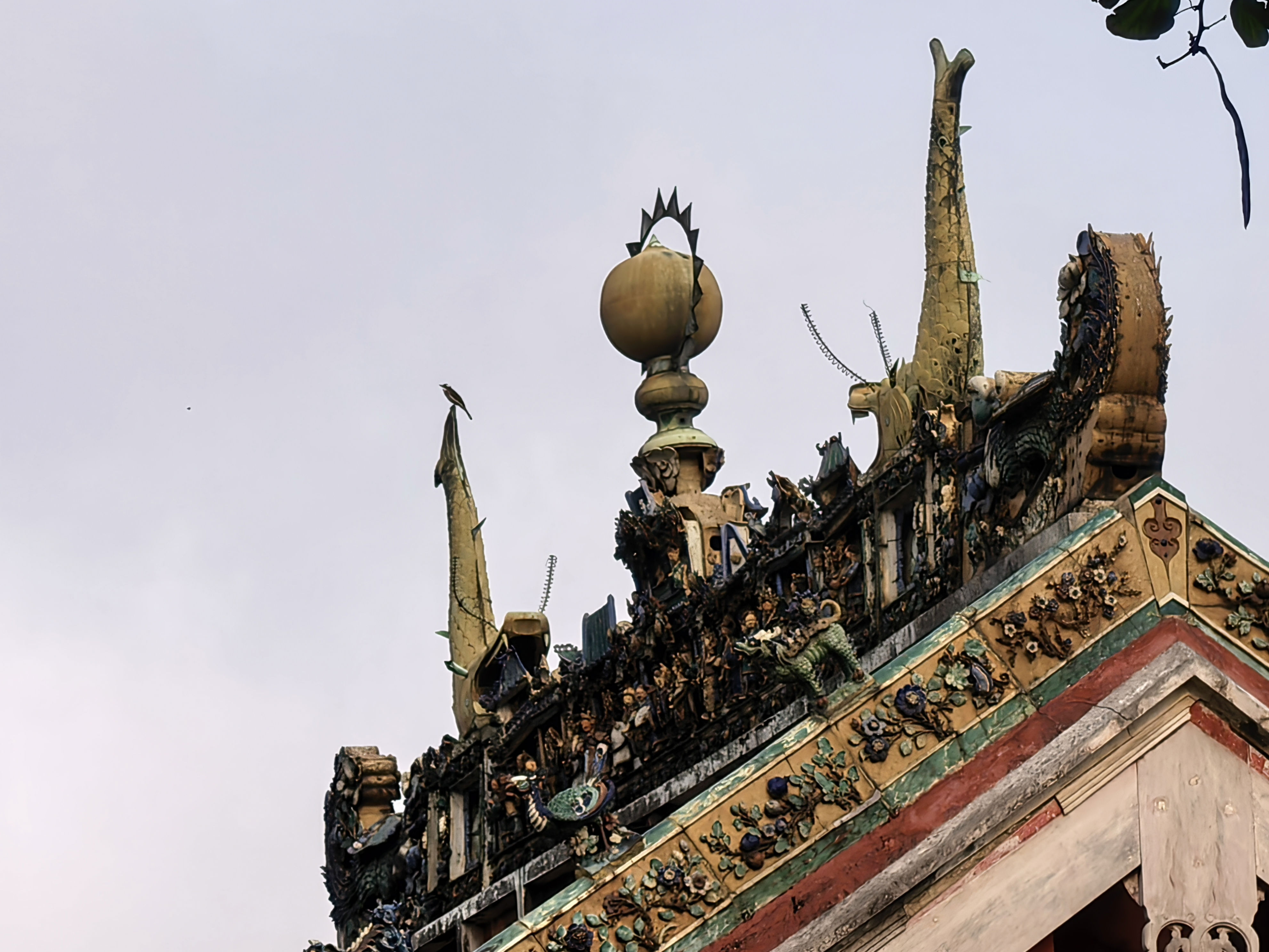 而檐角之上,象征着威严、吉祥与神通的狮子、麒麟、天马、海马等瑞兽列队而立,造型古朴灵动。这些陶塑精灵虽静默无声,却以精湛的工艺诉说着佛山古镇的岁月变迁,不论是清晨还是夕阳西下的时候,这些小“灵宠”的剪影,成为岭南民俗文化与建筑美学的完美融合。