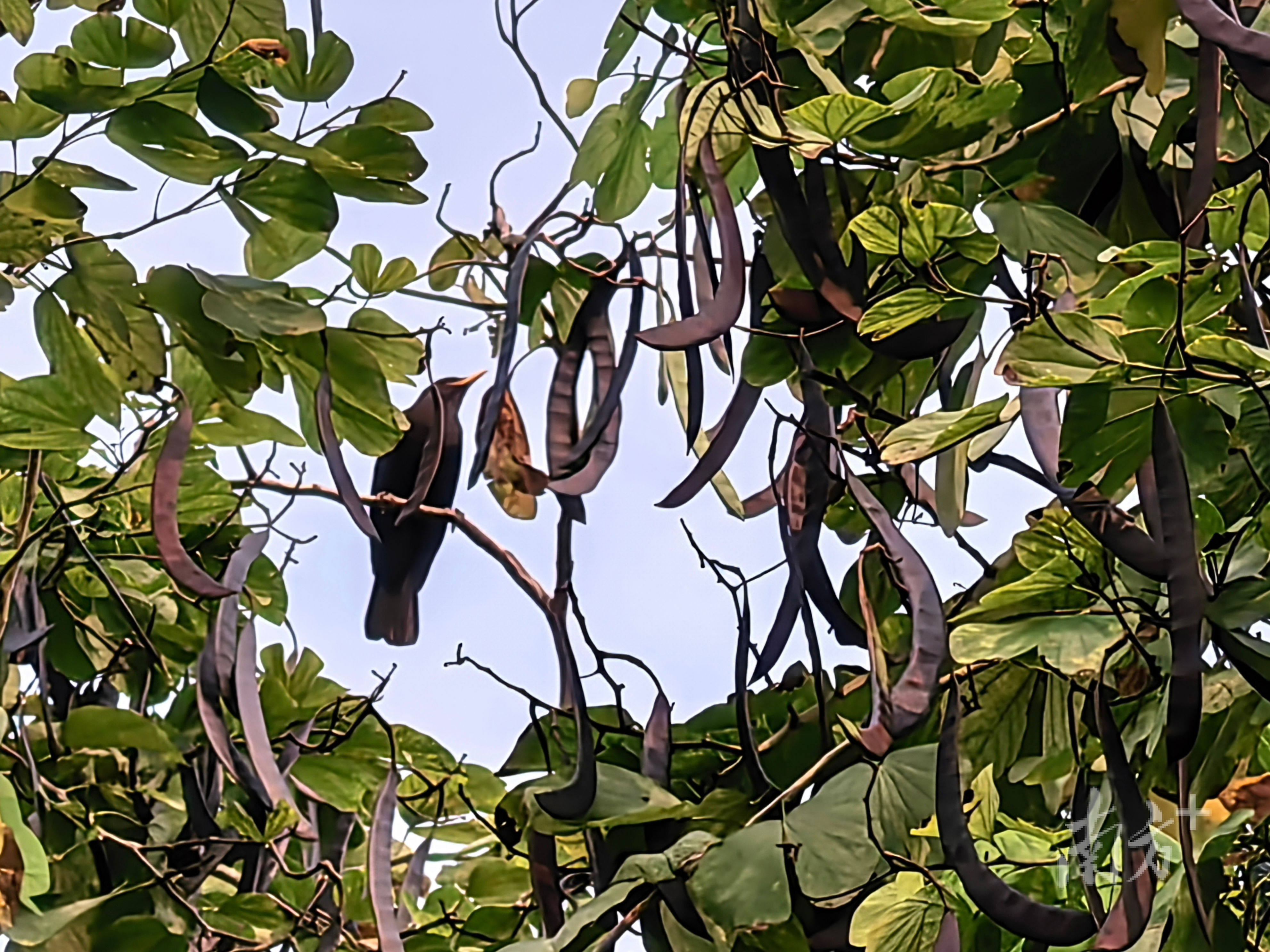 乌鸫立在枝头最高处,叽叽喳喳,与垂落的紫荆豆荚相映。阎锋 摄