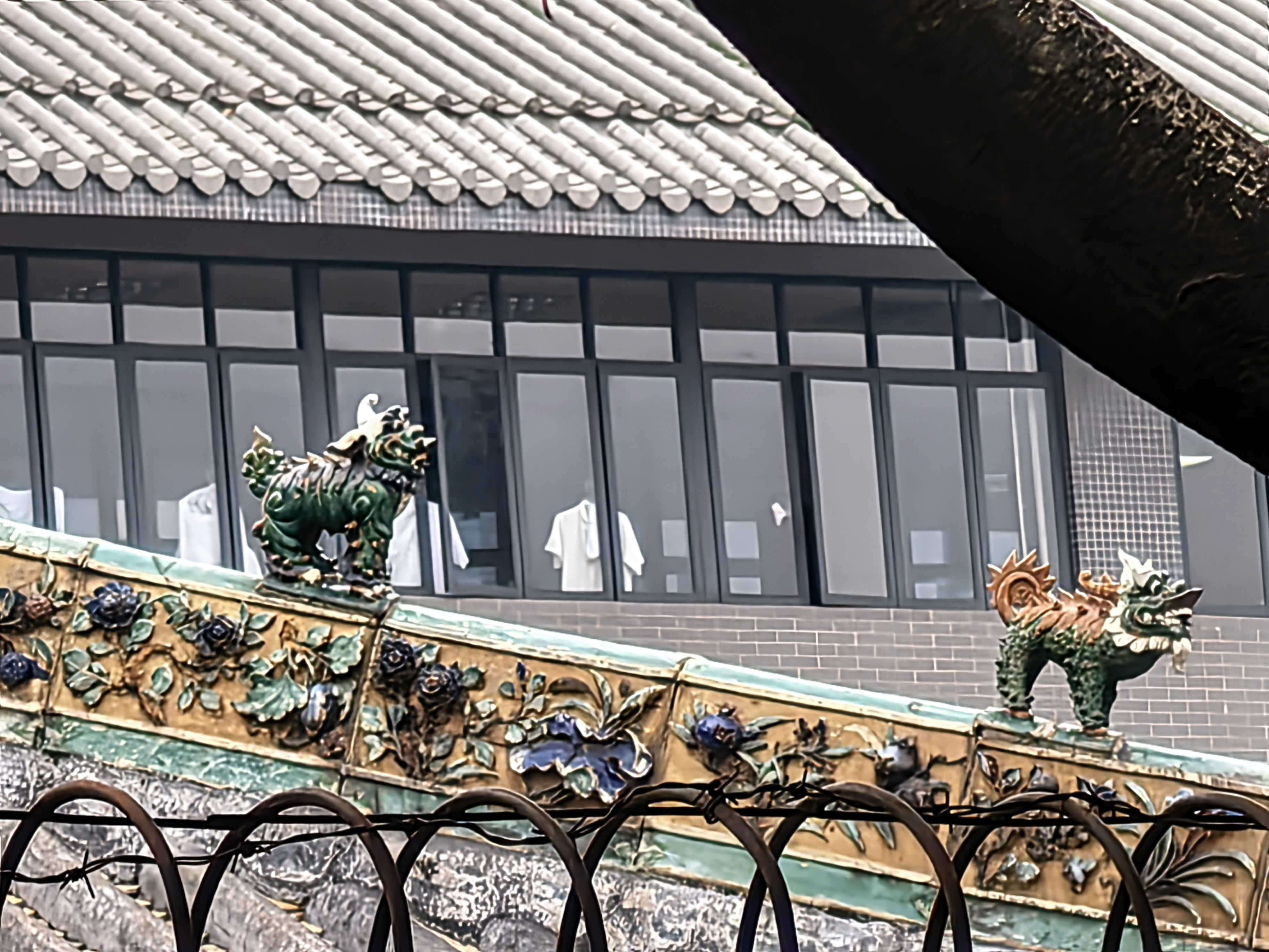 最有趣的,还是正殿瓦脊上那昂首欲跃的鳌鱼高高扬起、直指苍穹的尾尖上,时不时还会安然停落着小小的鸟儿。只见这小鸟“独占鳌头”不慌不忙梳理着羽毛,四下张望,仿佛脚下也并不是威严的神兽,只是寻常的屋檐、安稳的枝头。这样的画面,一时让人分不清,究竟是飞鸟误入了神话,还是神祇温柔地接纳了红尘。