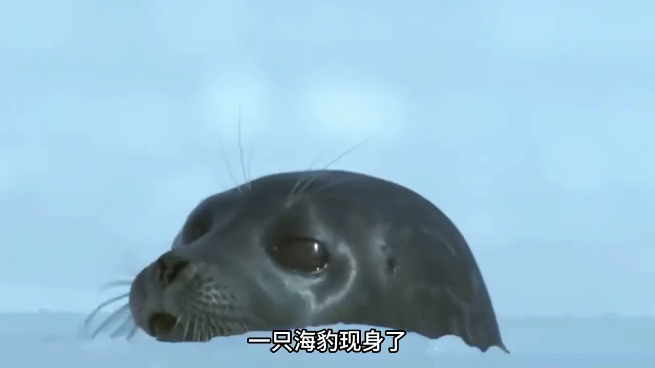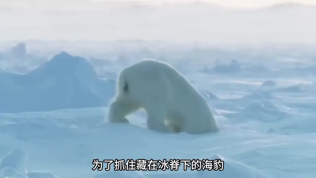 在它的前方,一只海豹现身了,这只海豹的警觉性很高,看见北极熊步步逼近,它担心自己的幼崽安危,海豹迅速从呼吸孔消失,然而小海豹不能长时间在水里憋气。