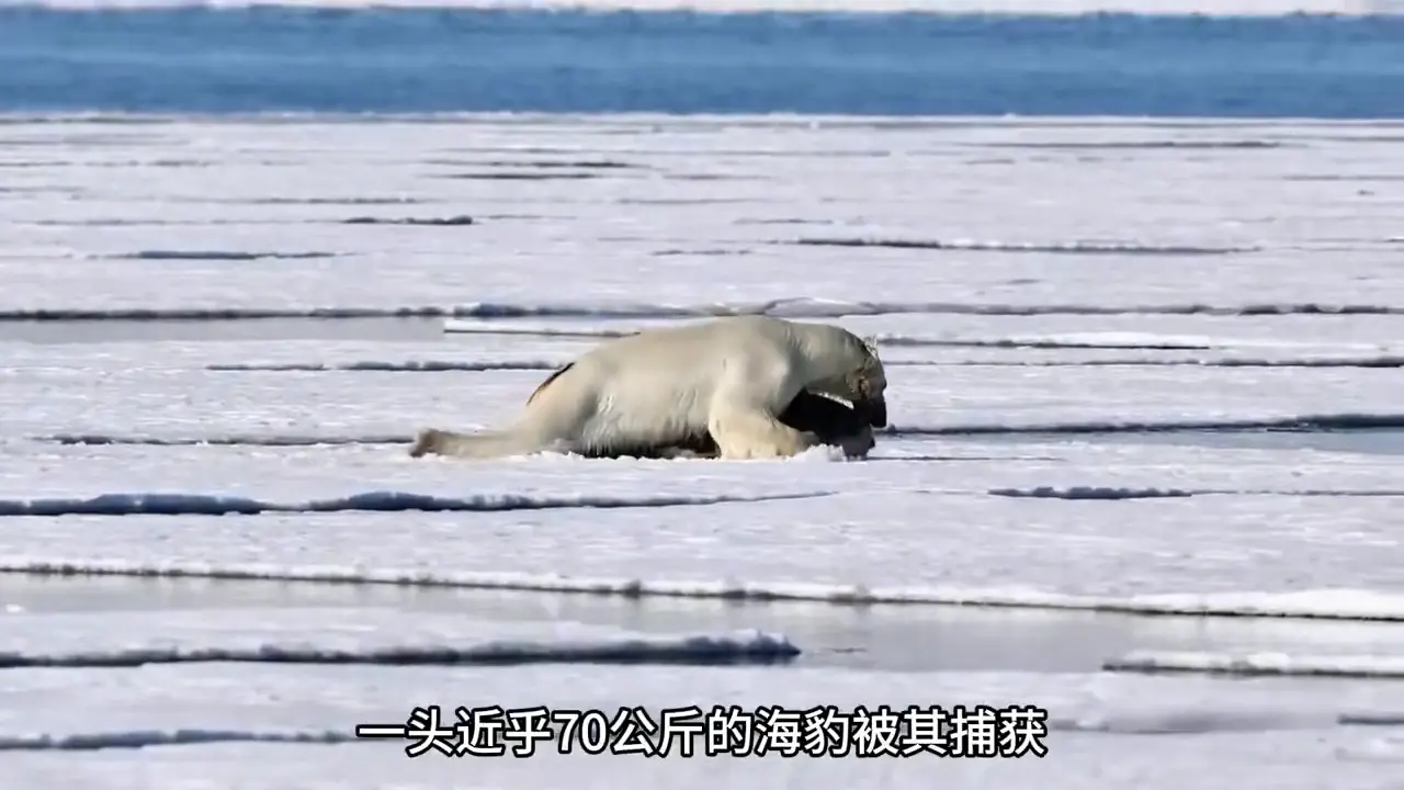 一头雄性北极熊迅速的从水里扑向冰面,海豹没有反应过来,北极熊立刻把整个身体重压上去,一头近乎70公斤的海豹被其捕获。海豹是北极熊最常狩猎的动物,而且仅需一头成年海豹提供的能量可支撑北极熊半个月以上不进食。